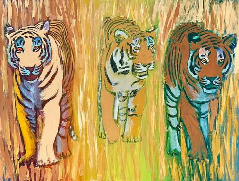 Bevægelse er liv og frihed. I malerierne har jeg beskrevet de gående tigre med forskellige farveklange der understreger deres gang.